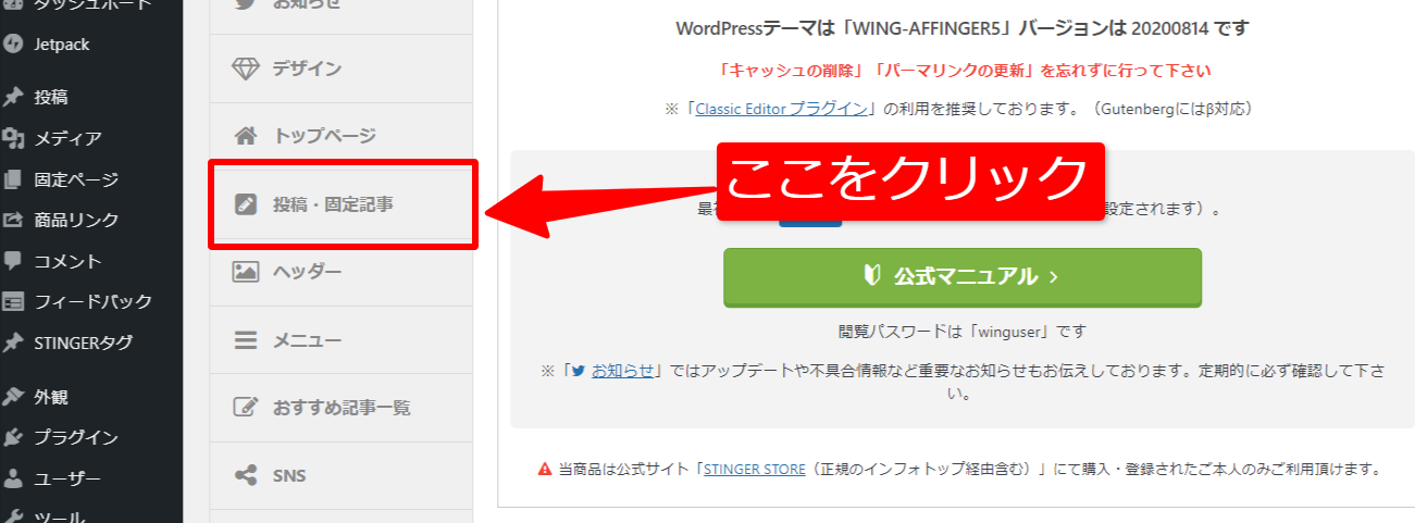 【投稿・固定記事】の部分を選択してもらって、【管理画面】の項目を見ていきましょう。
