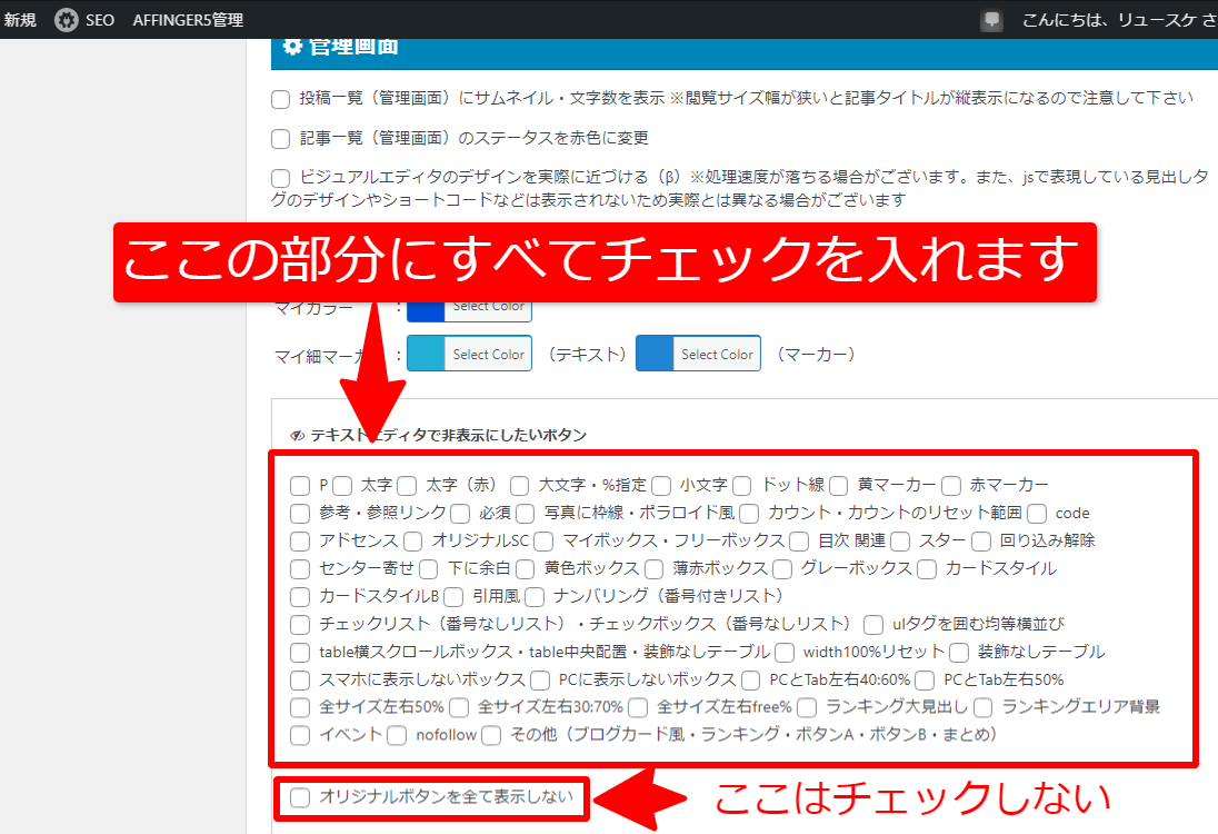 【オリジナルボタンを全て表示しない】という箇所はチェックをいれないでOKです。